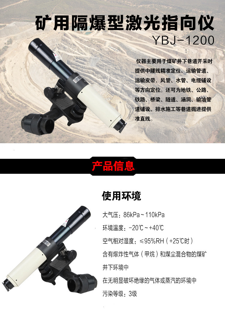 YBJ矿用隔爆型激光指向仪是集电子、光学、精密机械等技术为一体的仪器。具有外形美观、体积小、重量轻、防爆等特点。仪器安装采用固定式,通过悬挂组可快速固定在锚杆上。仪器可在360°范围任意粗调,微调准确;调节方便,制动可靠。产品采用自主研发的光学系统,可采用红、绿两种光源,光斑大小、射程满足矿下施工需求。仪器采用交直流转换电源模块,交流宽电压AC80V~AC245V供电,具有保护功能。